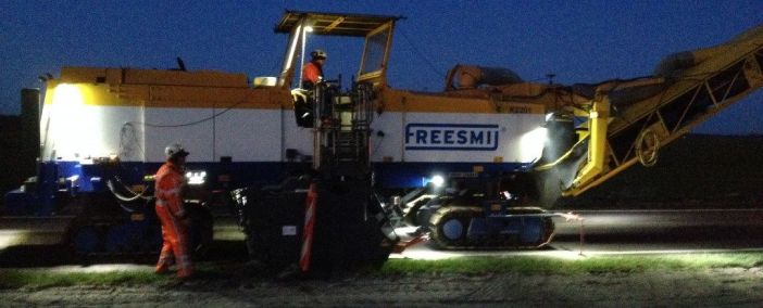Letztes Wochenende war der Tag. Freesmij setzt den Road Profiler erstmals erfolgreich für seinen Kunden Heijmans Integrale Projecten ein. Es gab großes Interesse an dieser Kugel. Auf der Strecke Venekoten – Drenthe Grenze begann das Profilfräsen gegen 21:00 Uhr mit einem 3,80 Meter langen Fräser. Mit dem Road Profiler kann Freesmij auf einfache Weise das richtige Profil für seinen Kunden ohne Nummern auf der Fahrbahnoberfläche anwenden. Dies spart Zeit bei der Vorbereitung und erhöht die Arbeitsqualität. André Berning von Heijmans zeigte sich begeistert: „Das ist die Zukunft“.